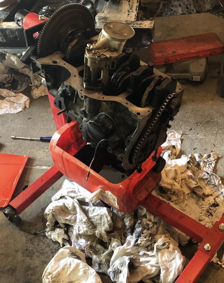 Pour transformer Titine en véritable voiture de compétition, les Tatoués du Désert ont décidé de tout reprendre à zéro. La première étape : déposer le moteur. Cela permet ensuite de retirer la caisse du châssis et de remplacer le plancher, attaqué par la rouille perforante. Quant au moteur, les Tatoués prévoient de le remettre à neuf après le confinement. Au programme : changement du joint de culasse et autres réparations essentielles.